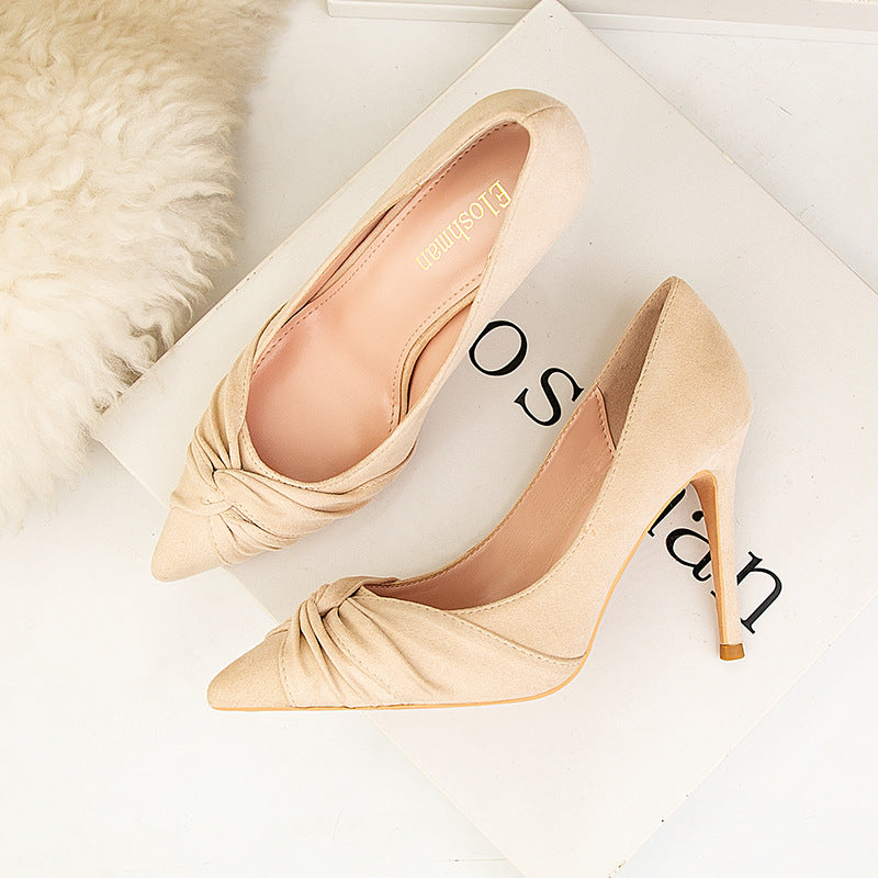 pumps evokes a sense of classic glamour. It features pointed toes embellished with suede bow.