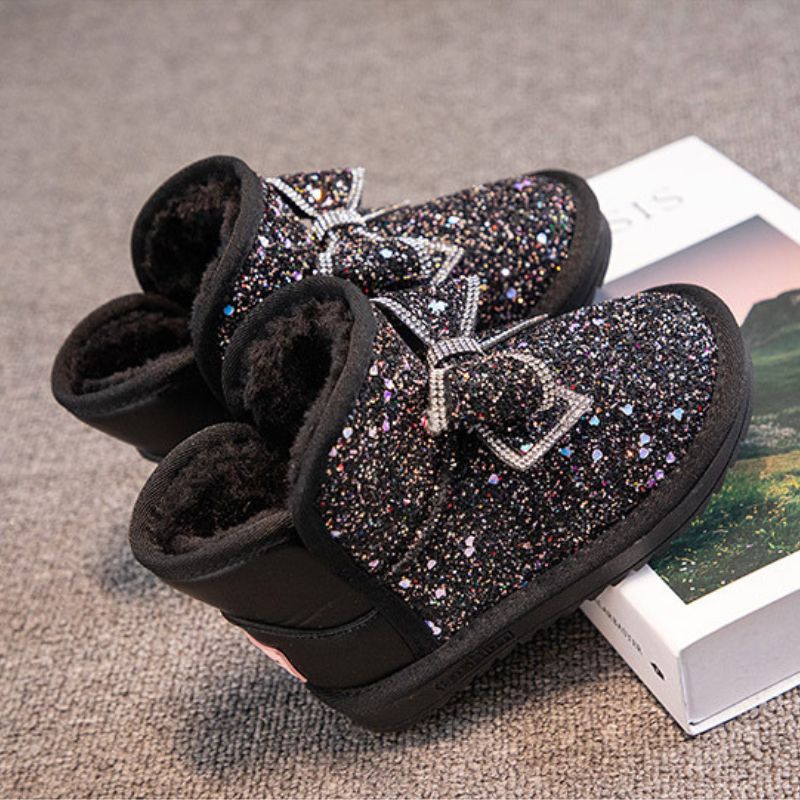 Eka Children's Rhinestone Bow-knot Snow Boots feature velvet. rhinestone. and bow decor along with a round toe for comfort. Crafted with warmth and non-slip rubber. these boots keep your little one's feet safe and stylish.