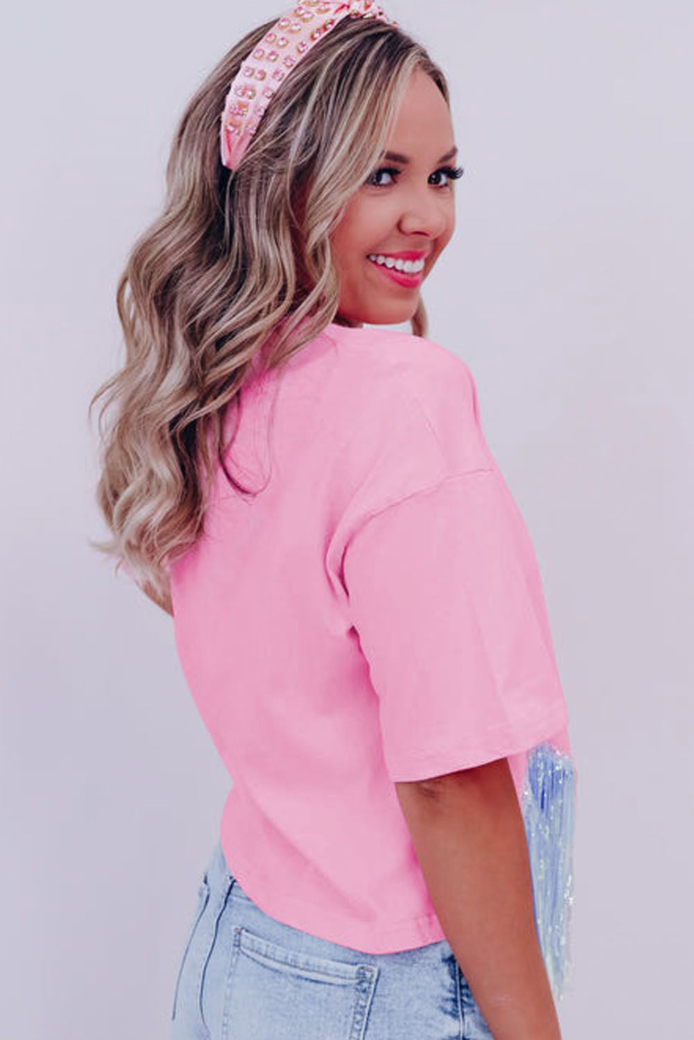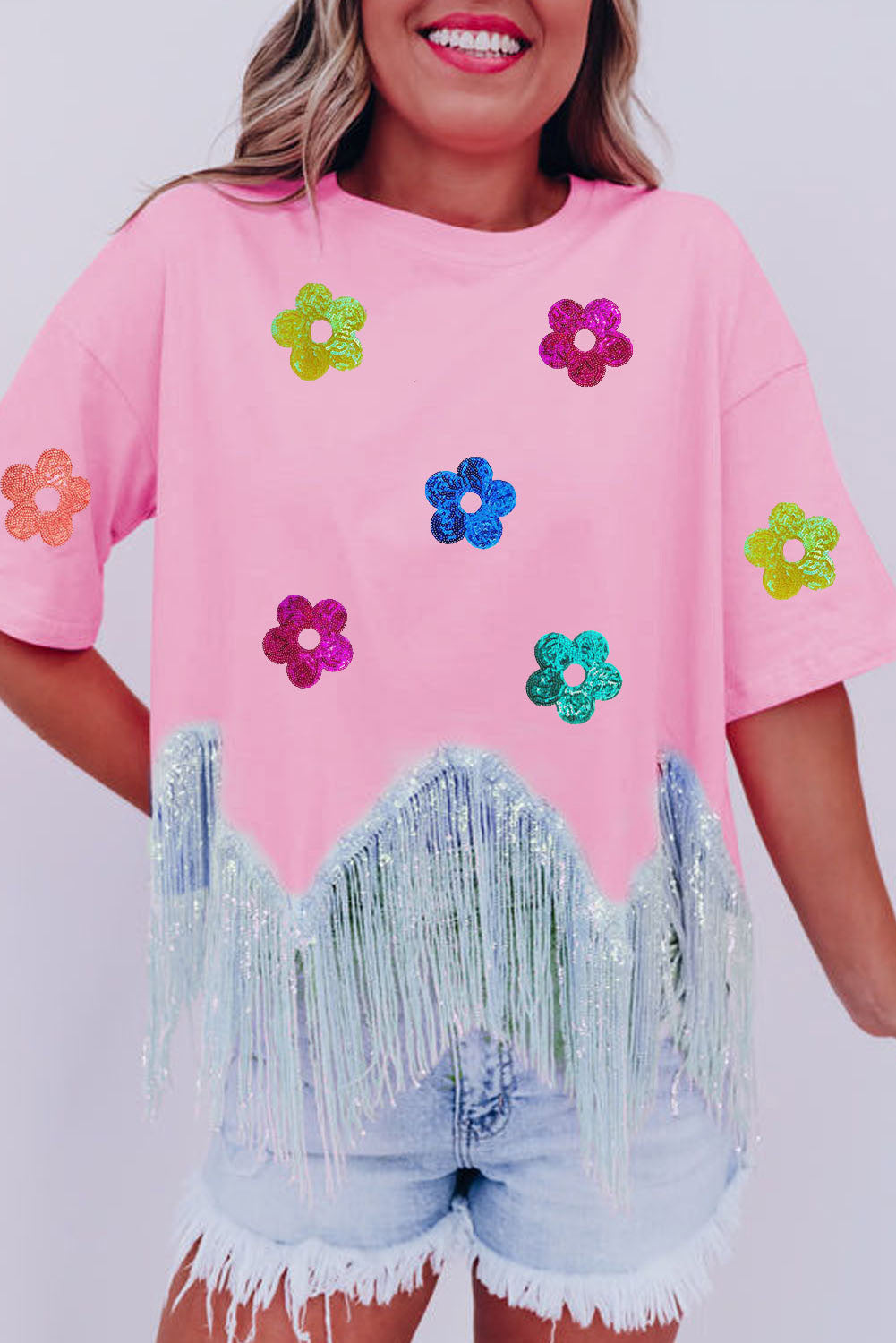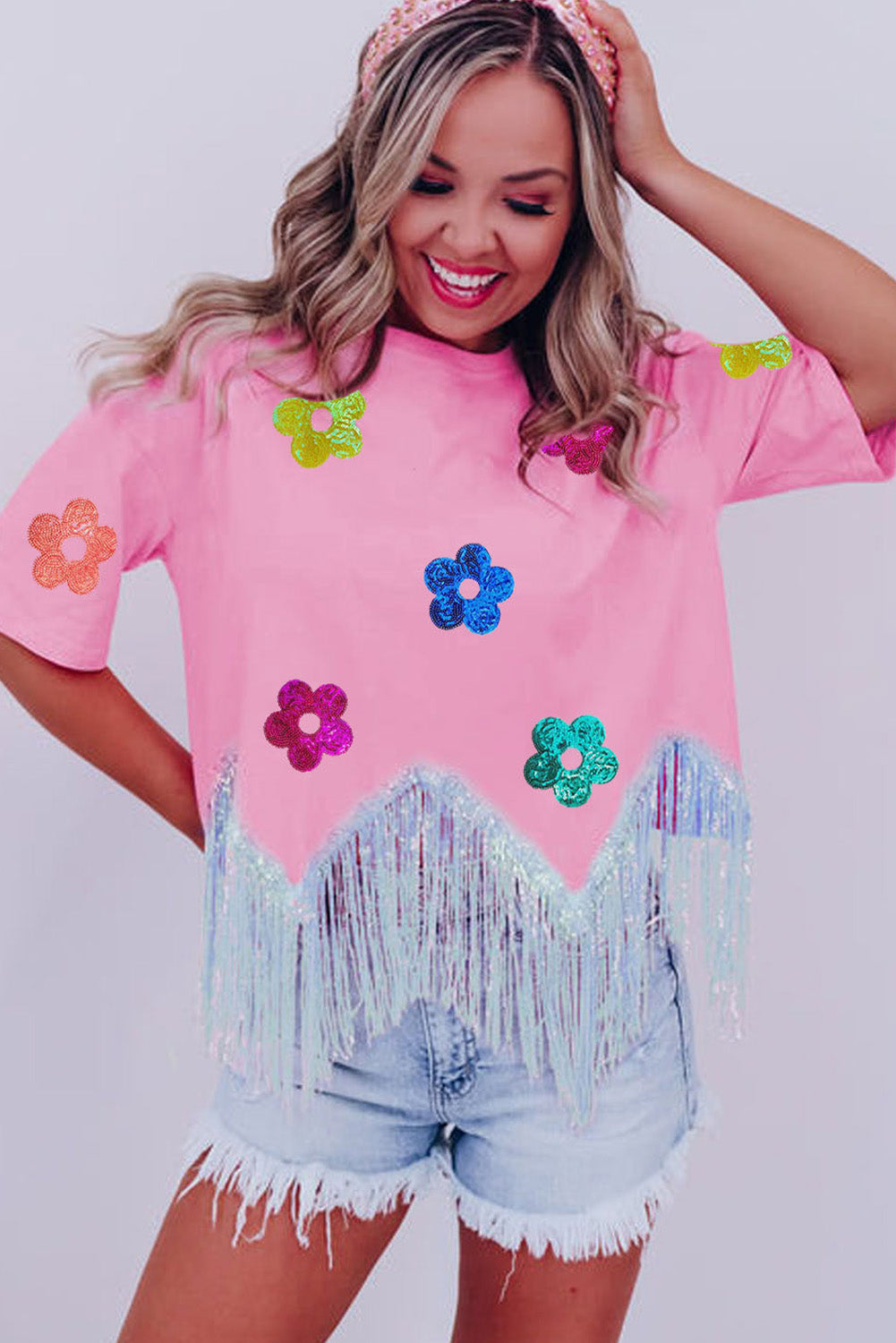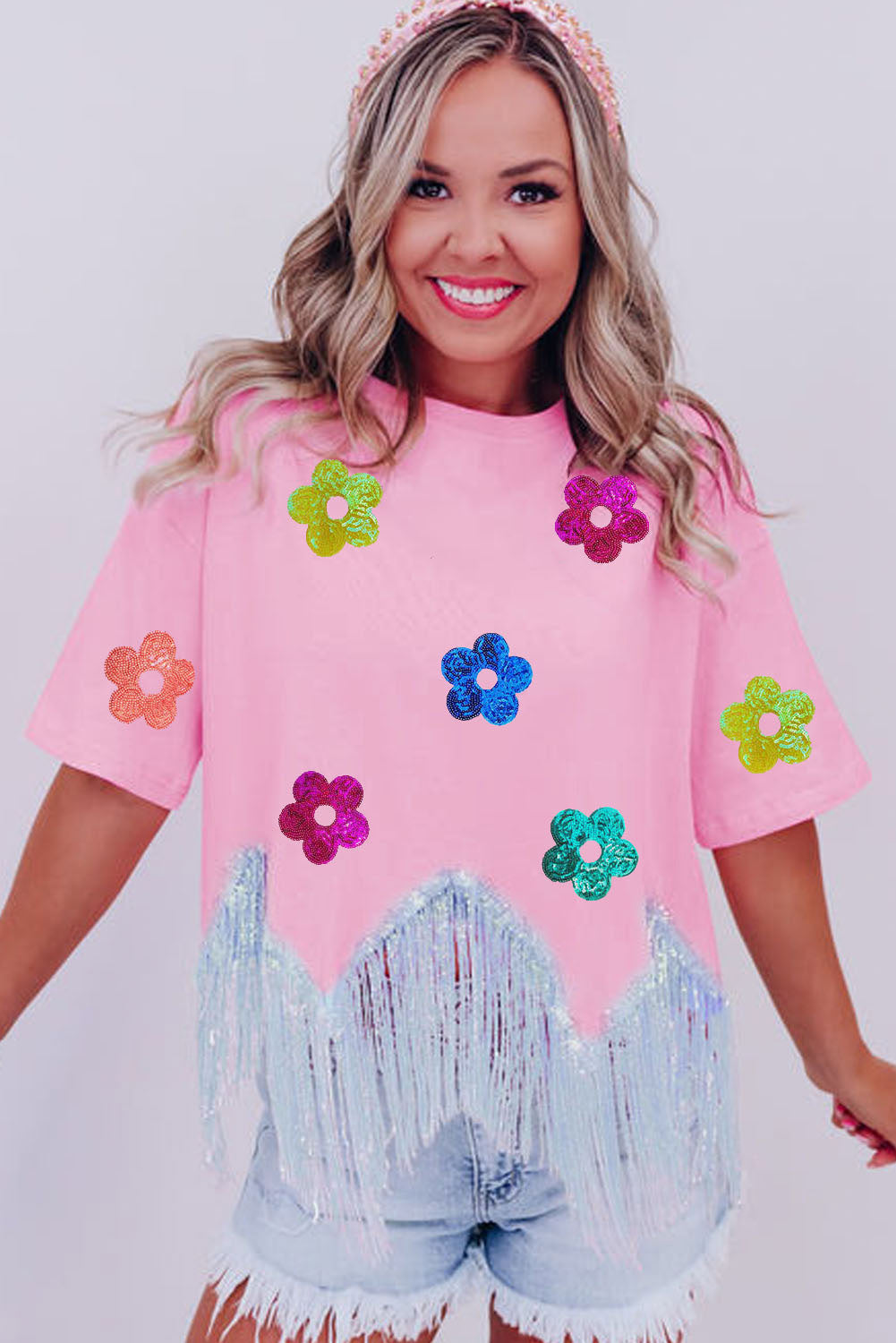 Pink Sequined Flower Tasseled Crew Neck Graphic Tee