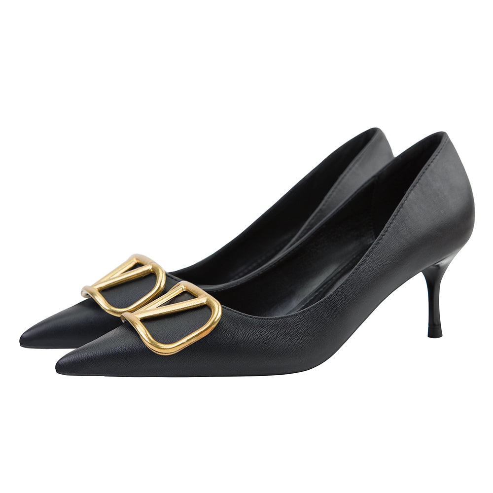 The Crocus pumps evokes a sense of classic glamour. It features pointed toes embellished with golden V-letter hardware.